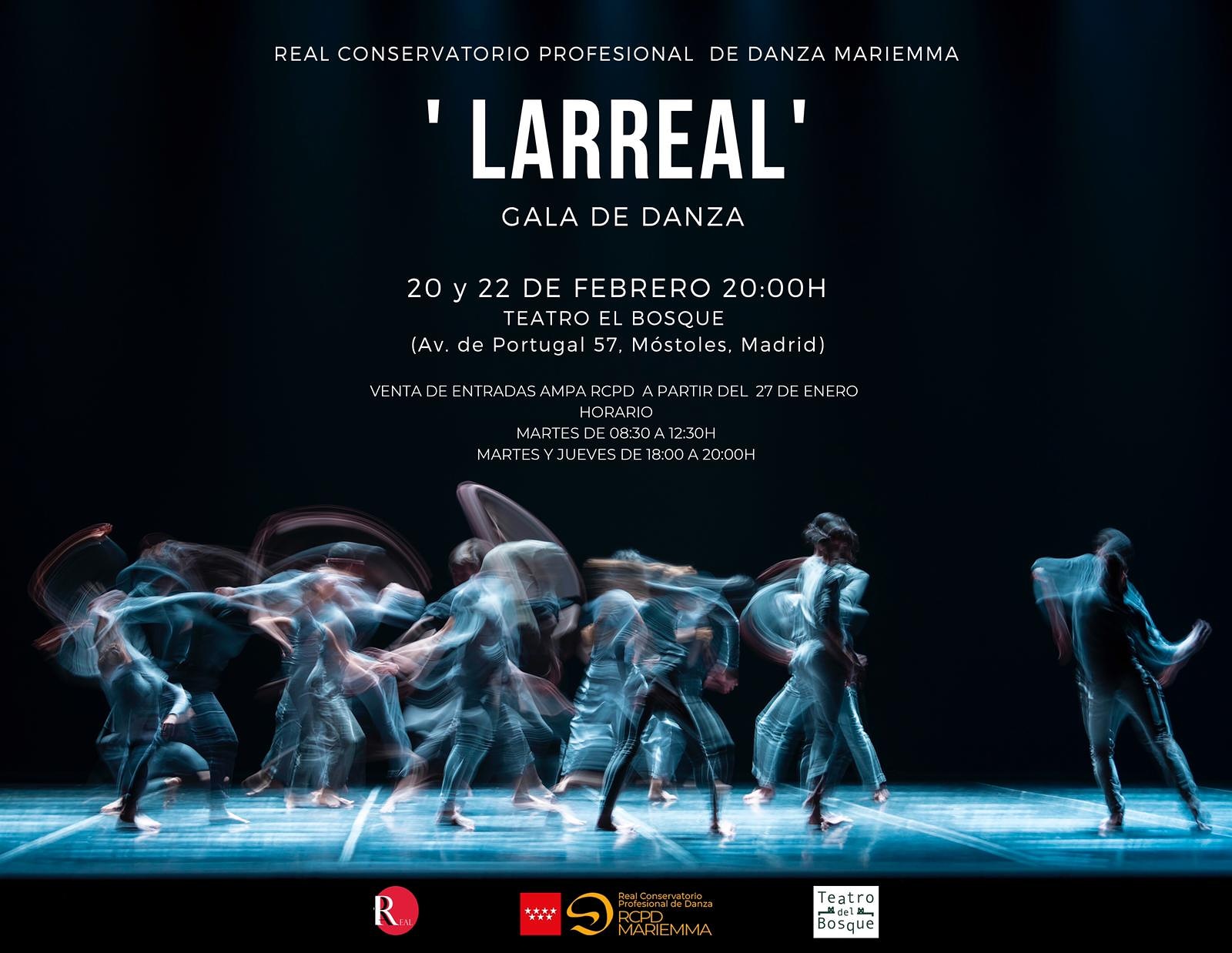 El próximo lunes 27 de enero a las 18.00h. comenzará la venta anticipada de entradas para las funciones de "Larreal Gala de Danza" que tendrán lugar en el Teatro del Bosque de Móstoles el jueves 20 de febrero a las 20.00h y el sábado 22 de febrero a las 20.00h. En estas galas se presentarán nuevas propuestas coreográficas interpretadas por los alumnos de los últimos cursos de las tres especialidades que se imparten en el conservatorio: Danza Clásica, Danza Contemporánea y Danza Española. En el programa podremos ver el trabajo de coreógrafos de prestigio con un repertorio muy variado como un extracto del ballet clásico "La Sylphide" de Arantxa Argüelles, contemporáneo con "Galea" y "I don't know" de nuestro maestro José Reches, "KORRIDOR" a cargo del coreógrafo Gentian Doda y creada para los Talleres de la Compañía Nacional de Danza, "En qué tierra..." estreno absoluto de una pieza de danza española de Antonio Pérez y el folclore con "La buena novia?" coreografía de nuestra directora y maestra de danza tradicional Arantxa Carmona. Un espectáculo para todos los públicos.